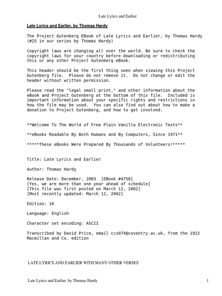 Late Lyrics And Earlier With Many Other Verses By Hardy Thomas 1840 1928 Pdf Project Gutenberg E Books
